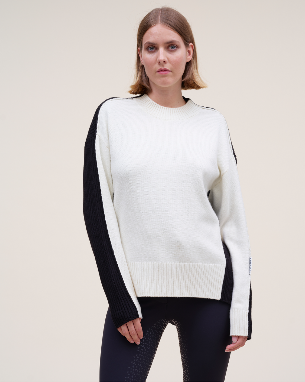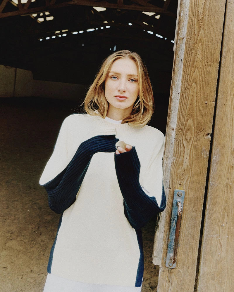 - Two-tone loose-fitting sweater with funnel neck
