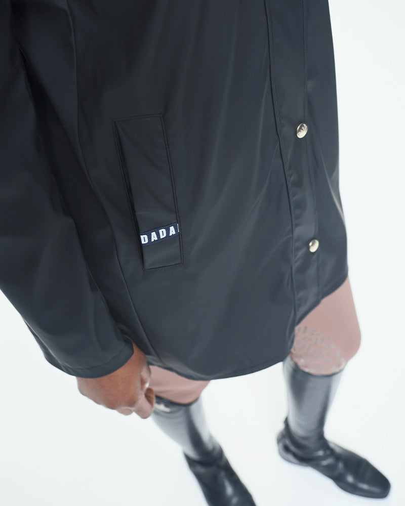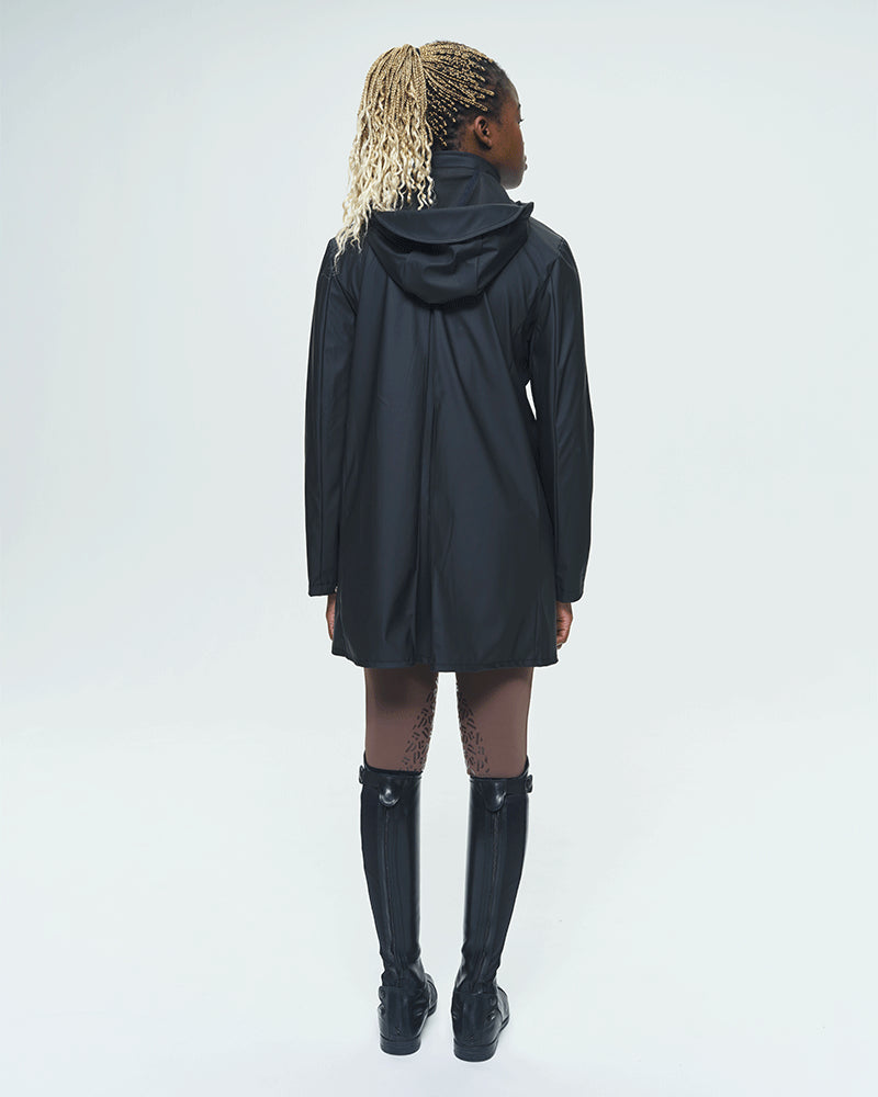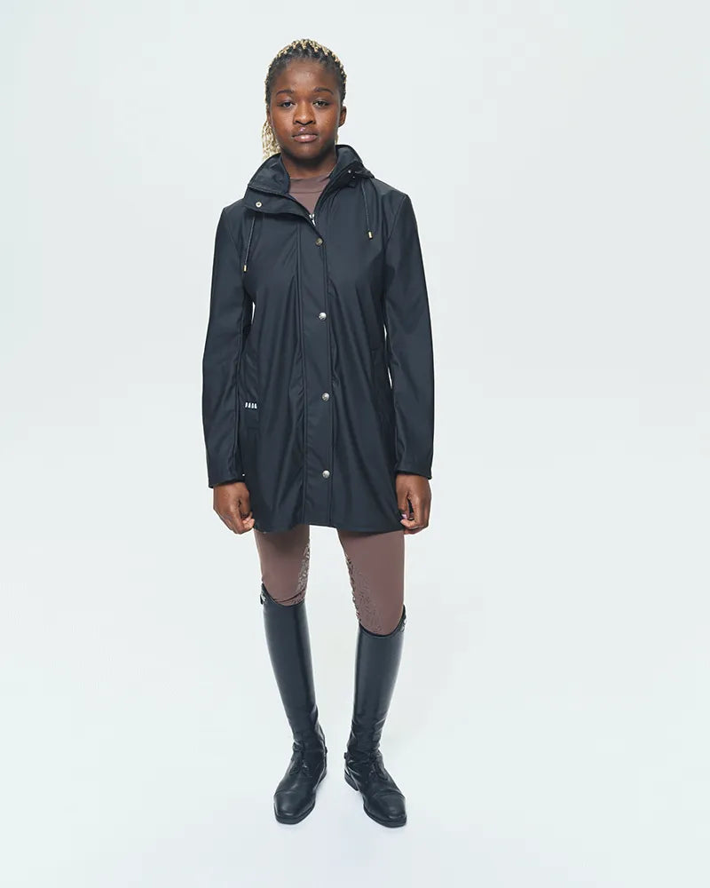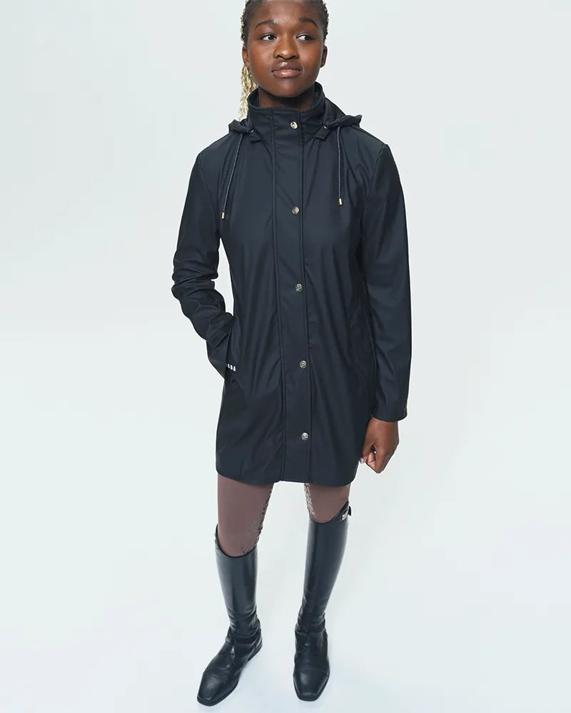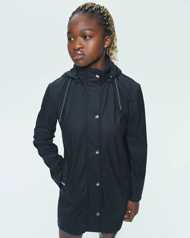 Raincoat combining elegance and practicality. Fitted cut, removable hood and waterproof fabric: perfect for facing rainy days.