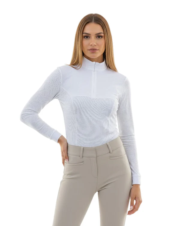 The Ophelia Shirt is both delicate and technical. The arms are covered in lace and provides a featherweight feeling. Traditional white collar and cuffs make this shirt appropriate for all show rings. The front zip closure is easy and the tapered fit looks form flattering. Available in Pink Flora, White, Forest, Jet Black, Espresso, and Midnight Blue. The Ophelia Shirt is made from 73% Polyester, 27% Spandex.