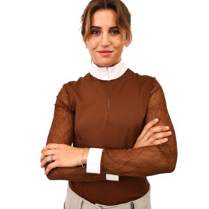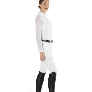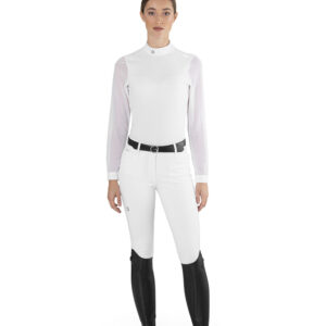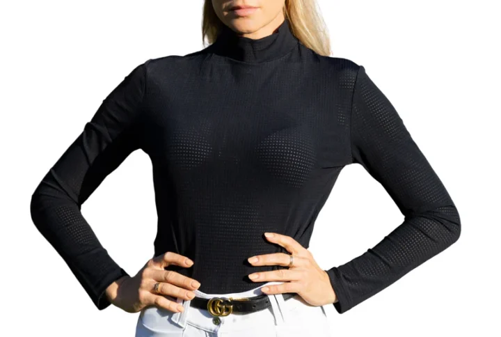 The Pauline Shirt is the most elite option for the competitive equestrian. The long sleeve perforated fabric combines a sleek design with technical advantages, such as muscle support, breathability, good abrasion resistance, and easy care. The white bib allows the Pauline Shirt to be worn in all show rings while keeping you cool, comfortable and covered. Available in White, Midnight Blue and Jet Black, and made from 80% Nylon, 20% Spandex.